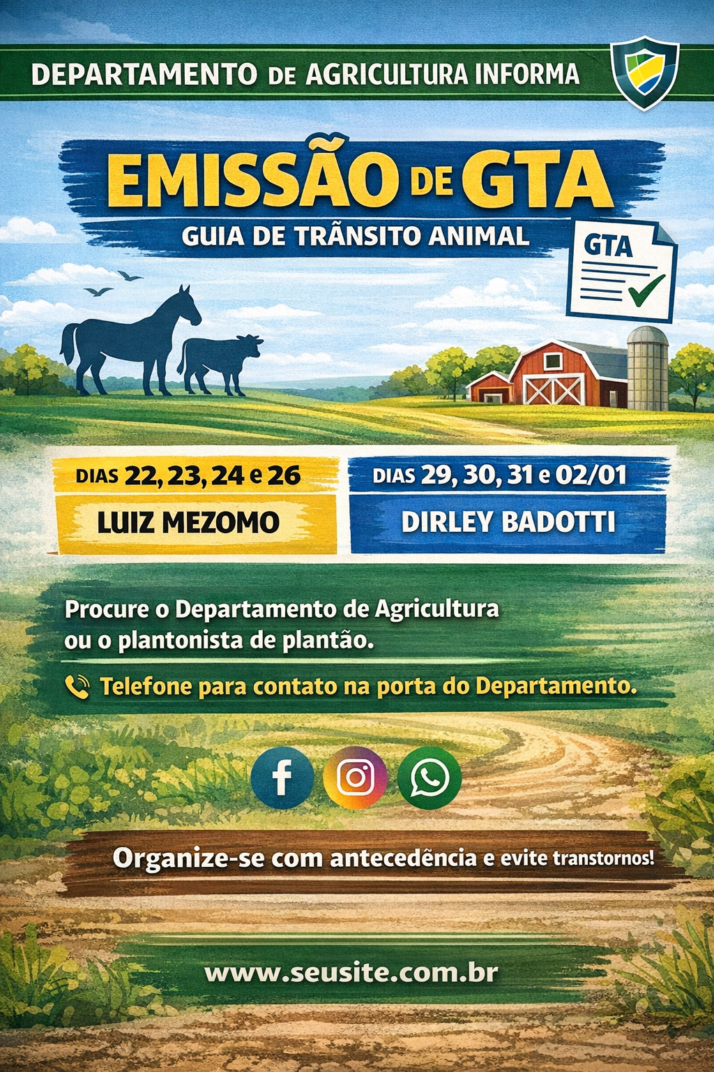 Escala para retirada de GTA junto ao Departamento de Municipal de Agricultura.